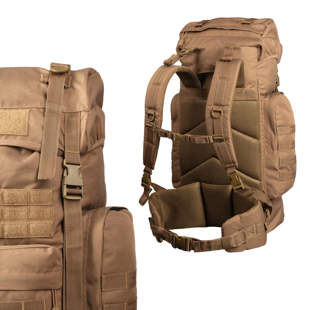 La Mil-Tec BW Kampfrucksack Gen.II en color Dark Coyote es una mochila táctica de alta resistencia diseñada para actividades outdoor extremas y uso militar. Su construcción robusta y diseño funcional la convierten en la compañera perfecta para expediciones, senderismo de larga distancia, camping y actividades tácticas.