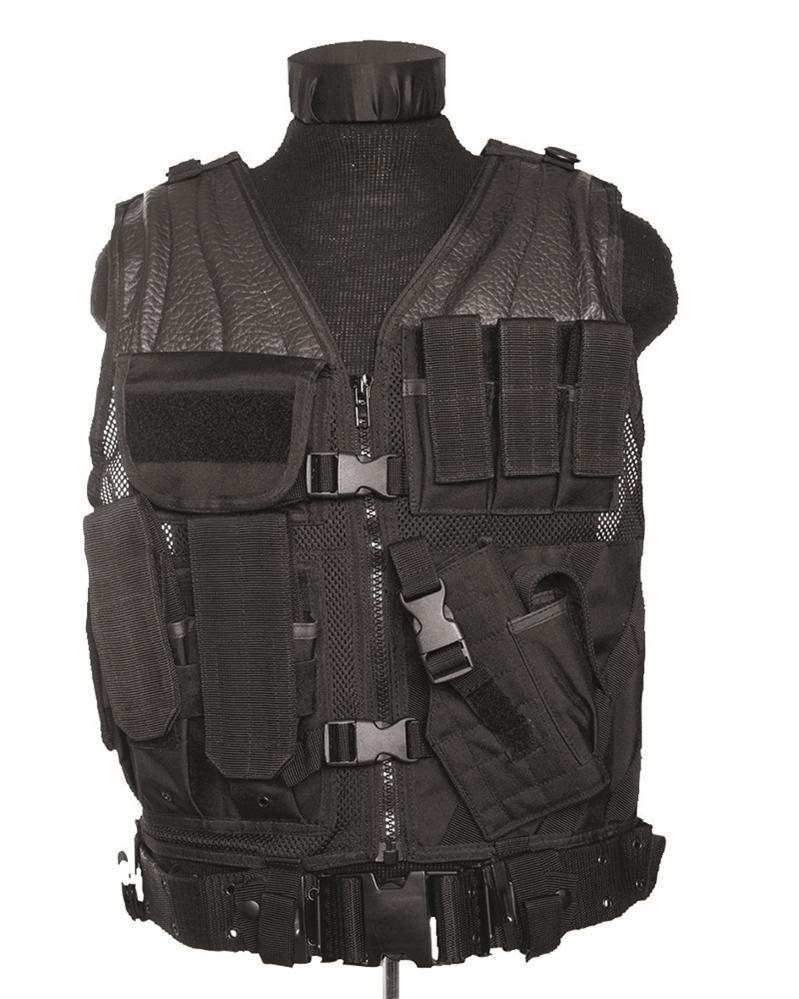 El lado derecho tiene 3 bolsas de munición, encima de las bolsas de munición, el lado derecho tiene una bolsa de transporte grande y una plataforma de tiro. El lado izquierdo cuenta con una funda de pistola capaz de transportar la mayoría de los medios Pistolas enmarcadas, 3 bolsillos de cargador de pistola que son totalmente ajustables a la altura de la mayoría de los cargadores de tamaño normal. El chaleco está montado sobre un material de malla de nailon resistente que ayuda a la ventilación. Los hombros del chaleco se pueden ajustar con largas tiras de velcro, y también tienen 2 anillos en D mentales para la fijación de mosquetones u otro material. El chaleco se cierra con cremallera en la parte delantera y se puede asegurar adicionalmente con un cinturón de pistola (incluido) enhebrado a través de los lazos en la parte inferior. El interior del chaleco tiene dos bolsillos para documentos con cremallera a la izquierda y a la derecha. La parte trasera del chaleco es de malla de doble capa que permite la adición de una vejiga de hidratación. Se proporciona un asa de transporte, así como tiras en la parte posterior para agregar material de camuflaje u otras bolsas. Los lados izquierdo y derecho se pueden ajustar para el ancho mediante cordones. Manufacturer: Mil-Tec