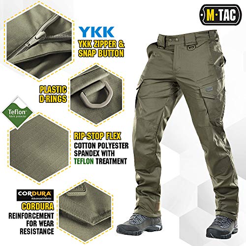 Los pantalones tácticos M-TAC Aggressor Gen.II Flex combinan resistencia y funcionalidad para uso profesional y outdoor. Fabricados en material Rip-Stop con mezcla de algodón y poliéster de 215 g/m2, ofrecen máxima durabilidad contra rasgaduras manteniendo comodidad. El tratamiento Teflon proporciona repelencia parcial al agua, ideal para condiciones adversas. Los refuerzos de Cordura en bolsillos garantizan resistencia en las zonas de mayor desgaste, mientras que el espacio reforzado permite portar navaja o herramienta multiusos de forma segura. El diseño incluye ajuste elástico en cintura para mayor comodidad y compatibilidad con cinturones de hasta 55mm de ancho. Las anillas D-Ring frontales permiten añadir accesorios adicionales según necesidades. Cremalleras y botones fabricados por YKK aseguran fiabilidad a largo plazo. Compatible con rodilleras de neopreno M-TAC para protección adicional. Versátiles para despliegue operacional, actividades al aire libre o uso diario. Talla 34W x 32L en color verde oliva.