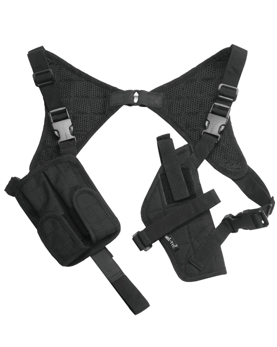 La pistolera de hombro Mil-Tec en color negro representa la solución ideal para profesionales de la seguridad, fuerzas del orden y entusiastas del airsoft que necesitan un sistema de transporte cómodo, discreto y altamente funcional.