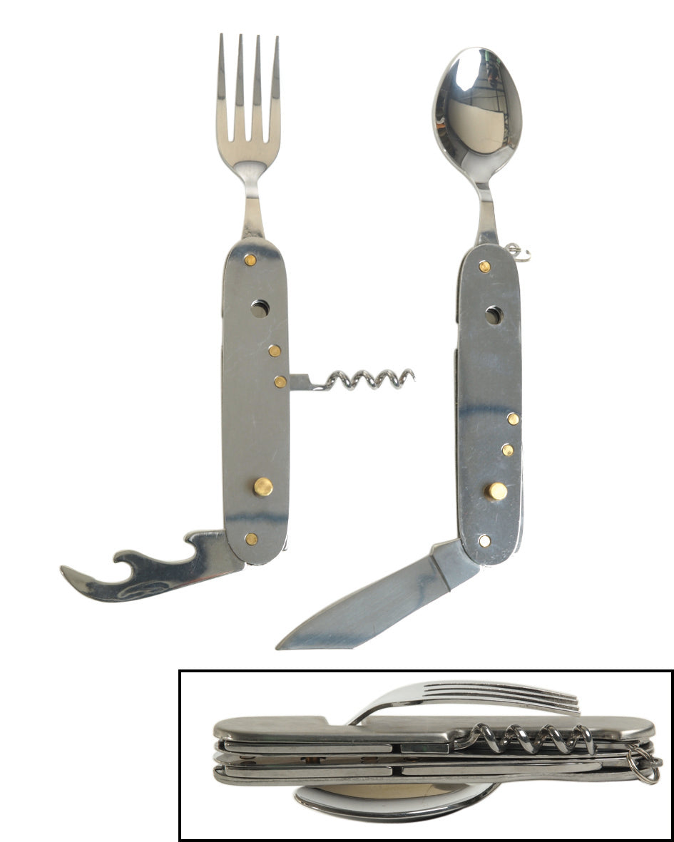 Diseñado con materiales resistentes y duraderos, este cubierto multiuso incluye las herramientas más necesarias para cualquier actividad outdoor: cuchillo, tenedor, cuchara y herramientas adicionales que te facilitarán las tareas del día a día en la naturaleza.