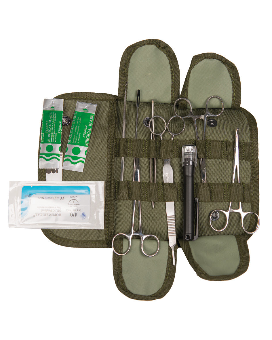 El Set Quirúrgico US Surgical de Mil-Tec es un kit médico profesional de 12 piezas diseñado específicamente para situaciones de emergencia que requieren atención sanitaria inmediata. Este conjunto de instrumental quirúrgico básico cumple con estándares de calidad militar, garantizando resistencia y durabilidad en las condiciones más exigentes.